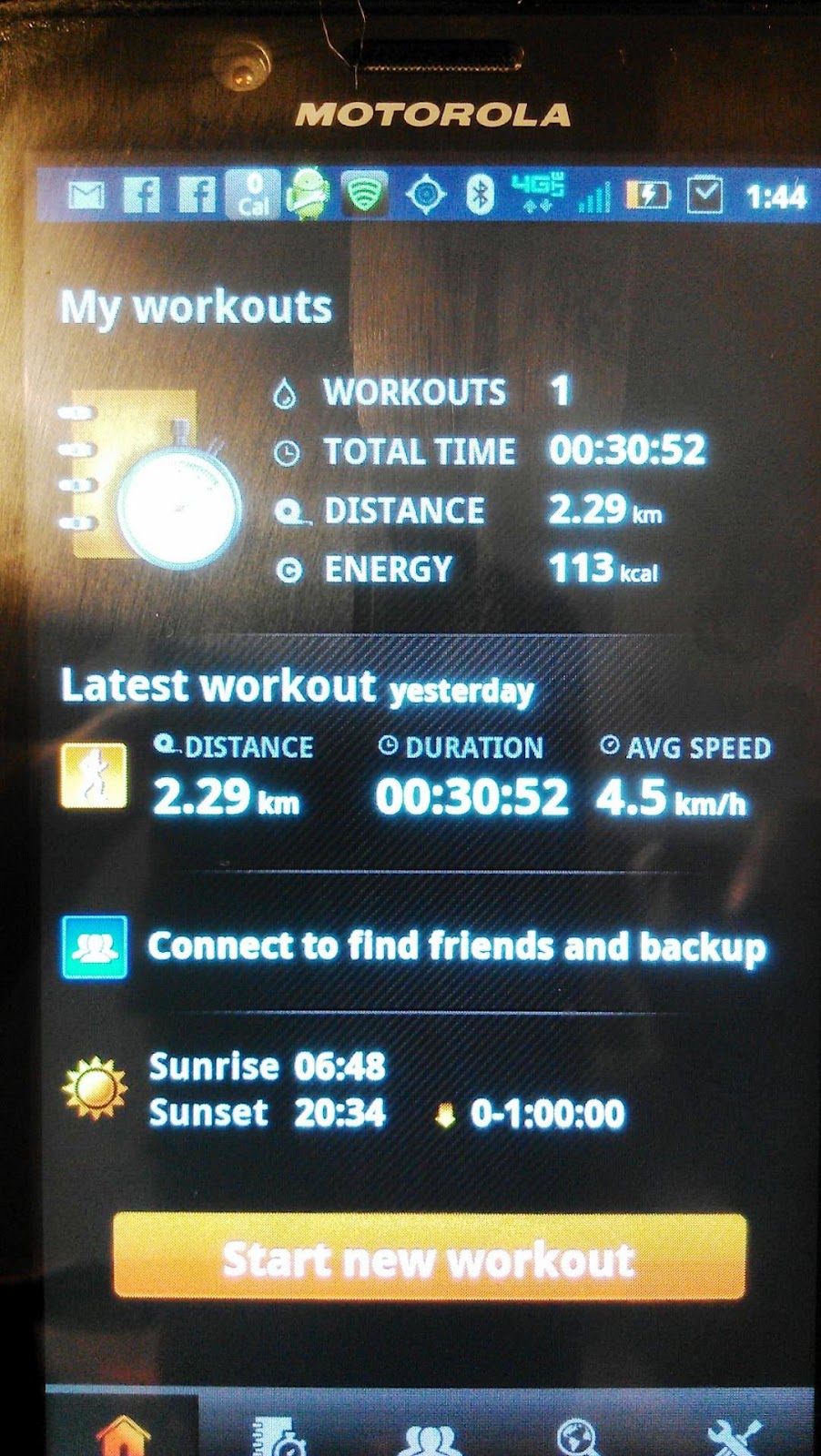When I was through I was a sweaty mess.. But I was ecstatic that I completed DAY 1 workout and didn’t cave into any excuses!!!! Below is my stats from the workout-using the sports tracker app on Android